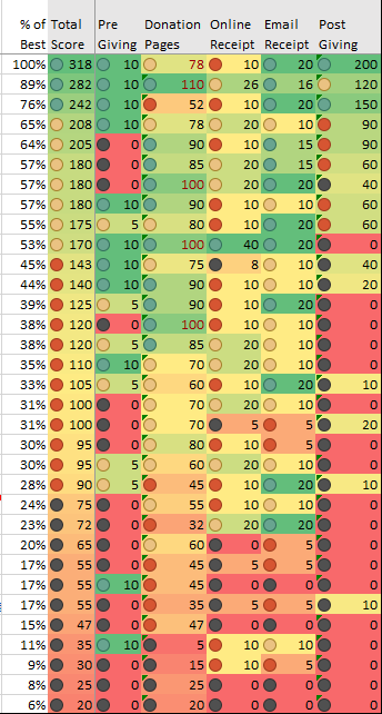 Fortium has tested online donations to over 100 nonprofits. We have looked at 31 items categorized into 5 major groupings with a database updated daily. Look at the sample of the scoring of the consolidated groupings for nonprofits.