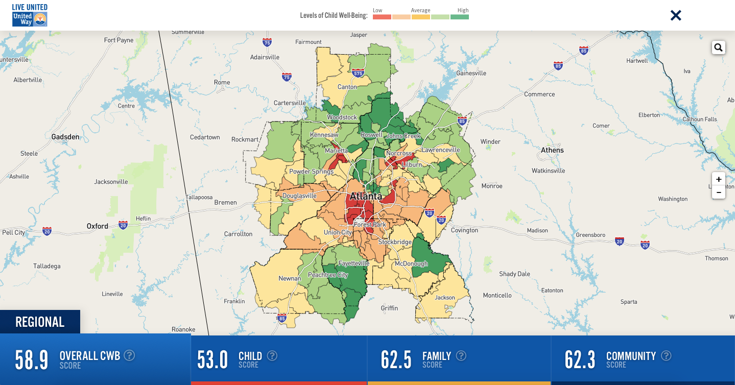 United Way of Greater Atlanta created the Child Well-Being Index, composed of child, family and community measures, to track the progress and effectiveness of the Child Well-Being Agenda. These scores are reflected in interactive maps and organized by zip code. Ming Hsi explains, “These maps help us identify the neighborhoods in the Greater Atlanta region that need the most help and resources.” There is significant disparity in Greater Atlanta with zip codes driving one’s destiny. The map below displays the varying levels of child well-being within the metro area.