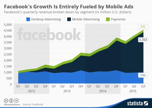 “When Facebook started selling mobile advertising in 2012, not even the keenest optimists could have predicted how successful this decision would turn out. In each of the past eleven quarters, mobile ads have accounted for more then 90% of Facebook’s revenue growth. In the first nine months of 2015, all of the company’s growth came from advertising on tablets and smartphones. Mobile ad revenue now accounts for 78 percent of Facebook’s advertising revenue and 74 percent of total revenue.