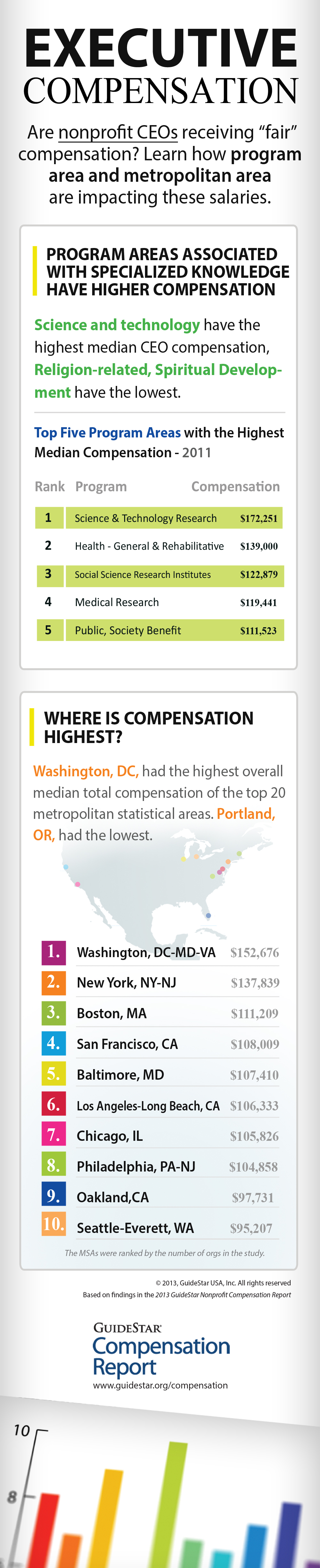 The GuideStar Nonprofit Compensation Report has been updated and published. It is helpful because it remains the only large-scale nonprofit compensation analysis based entirely on IRS data. Please note the report has a charge to it but some good summary data is in the infographic below.
