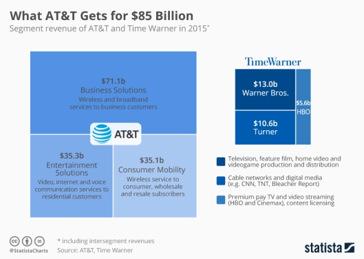What does A T & T get for $85 billion? Statista reports that “AT&T has made it official: The U.S. telecom giant has agreed to acquire Time Warner in a deal worth $85 billion. Still subject to regulatory approval, the deal would put AT&T in control of world-famous media brands such as CNN, TNT and HBO alongside Warner Bros. Entertainment, the world’s largest film and television studio in charge of franchises such as Harry Potter, Game of Thrones and the DC Comics universe.