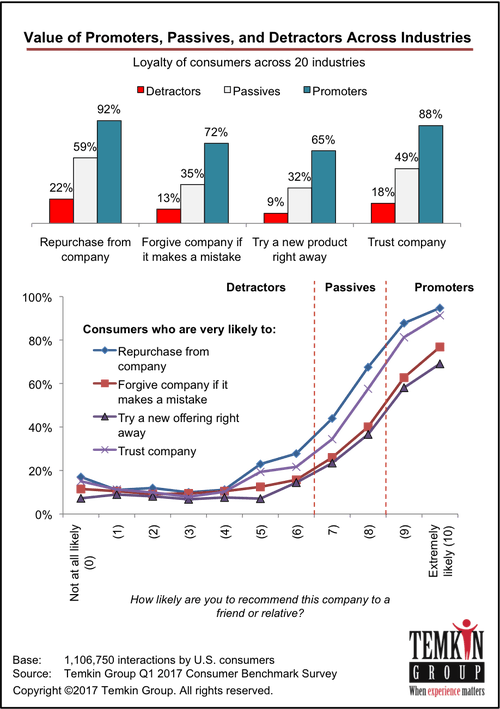 Compared to detractors, promoters are over four times more likely to repurchase from a company, over five times more likely to forgive a company if it makes a mistake, over seven times more likely to try new offerings from a company, and almost five times more likely to trust a company.