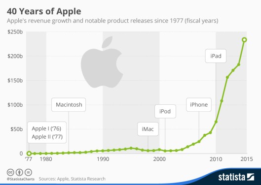 “While remarkably successful from the start – Apple went from zero to one and a half billion dollars in revenue within eight years – there were some ups and downs in the company’s early days. It wasn’t until Steve Jobs’ second stint as CEO that Apple became what it is today: the most valuable company in the world. With the release of the iPhone in 2007, Apple’s revenue (and profit for that matter) started to skyrocket, reaching a record $234 billion in fiscal 2015.