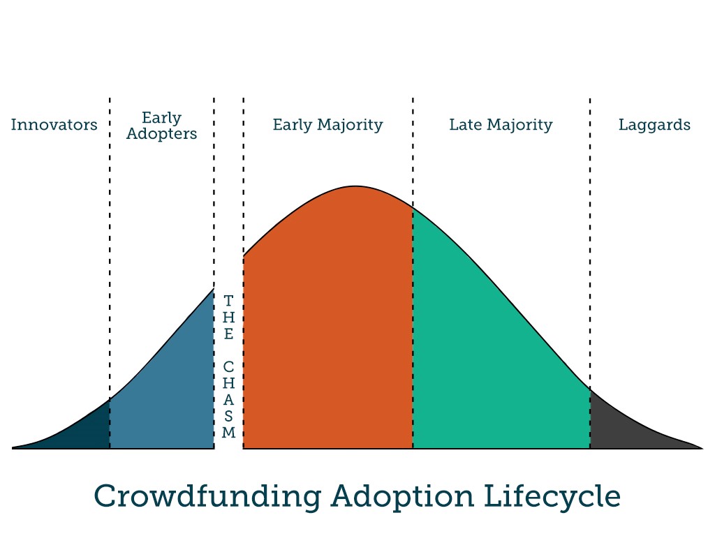 In his marketing book, Crossing the Chasm, Geoffrey Moore maintains that there is a chasm between early adopters of technology (visionaries) and the early majority (the pragmatists) with both groups having very different expectations. Leveraging the multiplying effect of the Internet and the ever-growing impact of social media, crowdfunding is a newly adopted idea executed using innovative technology. With the success of Give Local America – a May 2014 event that raised over $53 million in a single day – crowdfunding has crossed the chasm and is now being adopted by the “early majority.”