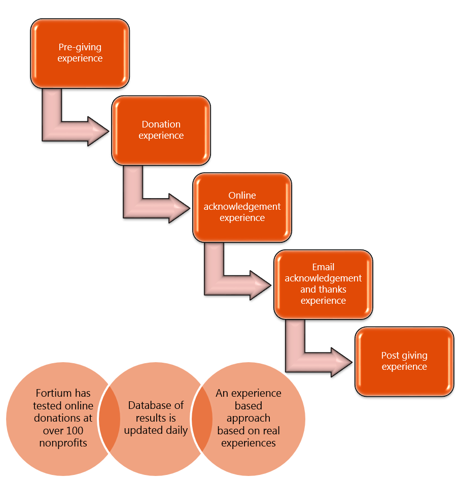 Fortium has tested online donations to over 100 nonprofits. We have looked at 31 items categorized into 5 major groupings with a database updated daily. Look at the sample of the scoring of the consolidated groupings for nonprofits.