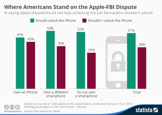 While tech companies such as Google and Facebook have voiced their support for Apple in the ongoing dispute, the American public is leaning towards the FBI on the issue. According to a survey conducted by the Pew Research Center, 51 percent of adults in the U.S. think that Apple should unlock the perpetrator’s phone while 38 percent think that Apple is right not to cooperate. Even among the company’s faithful, support is tepid at best: 47 percent of iPhone users think Apple should follow the FBI’s orders vs. 43 percent who don’t.