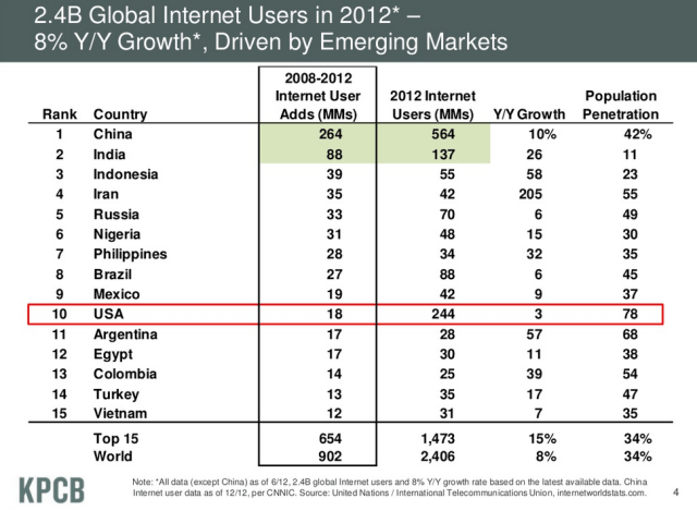 Your audience is 2.4 billion potential customers. You have international reach. Are you designing experiences with that audience in mind? The top 15 countries saw year to year growth of about 15% new users in 2012. Much of that is in emerging markets. The U.S has the highest penetration with 78% of the population connected. China added 264 million new users last year with only 42% penetration.